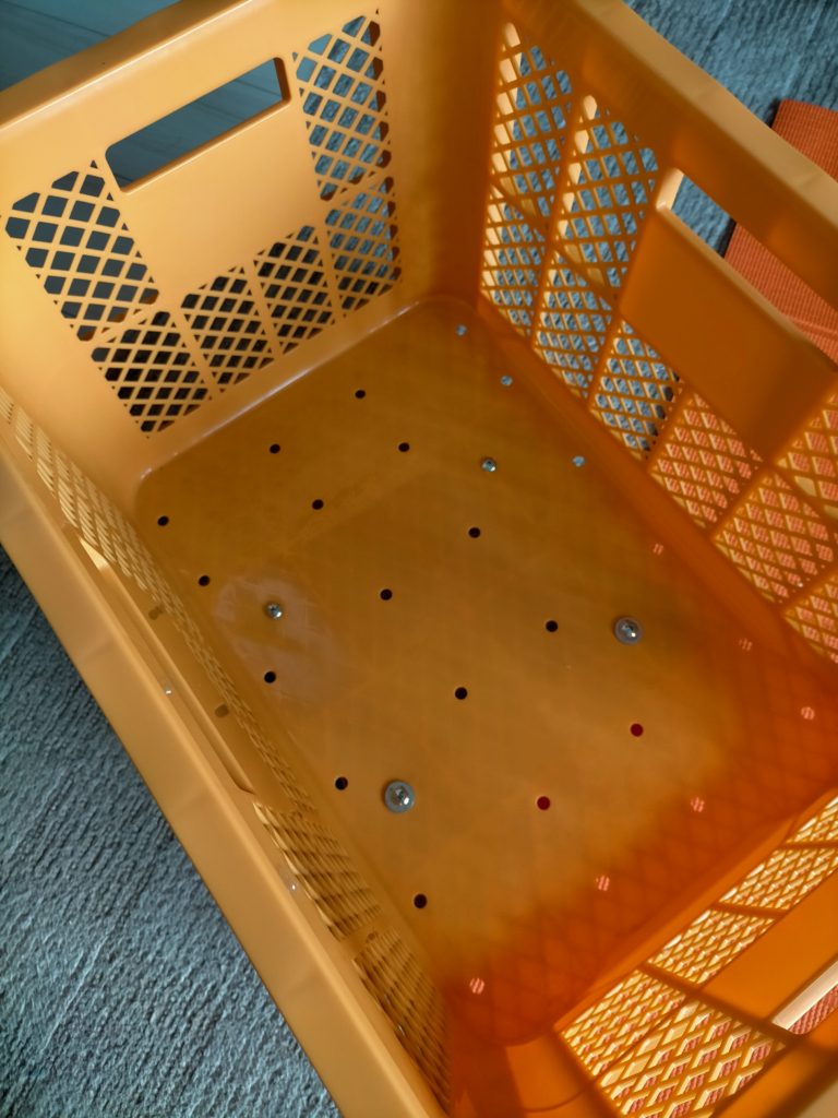 この器具の純正カゴ(自転車のカゴみたいな頼りないヤツ)なら、初めからちょうどいい位置にねじ穴が空いているようですが、やっぱりカブには収穫箱!ということで、気合の穴あけを敢行しました。