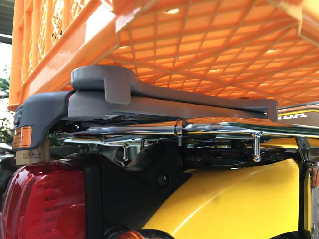 それはさておいて、カブ荷台への取り付けです(カゴに穴さえあれば超簡単)。