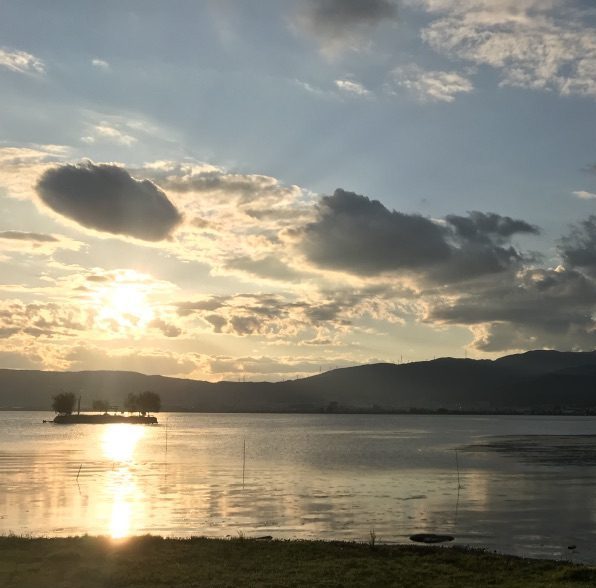 湖の島の上にちょうど夕日が差し掛かっているんですね。神秘的です。
